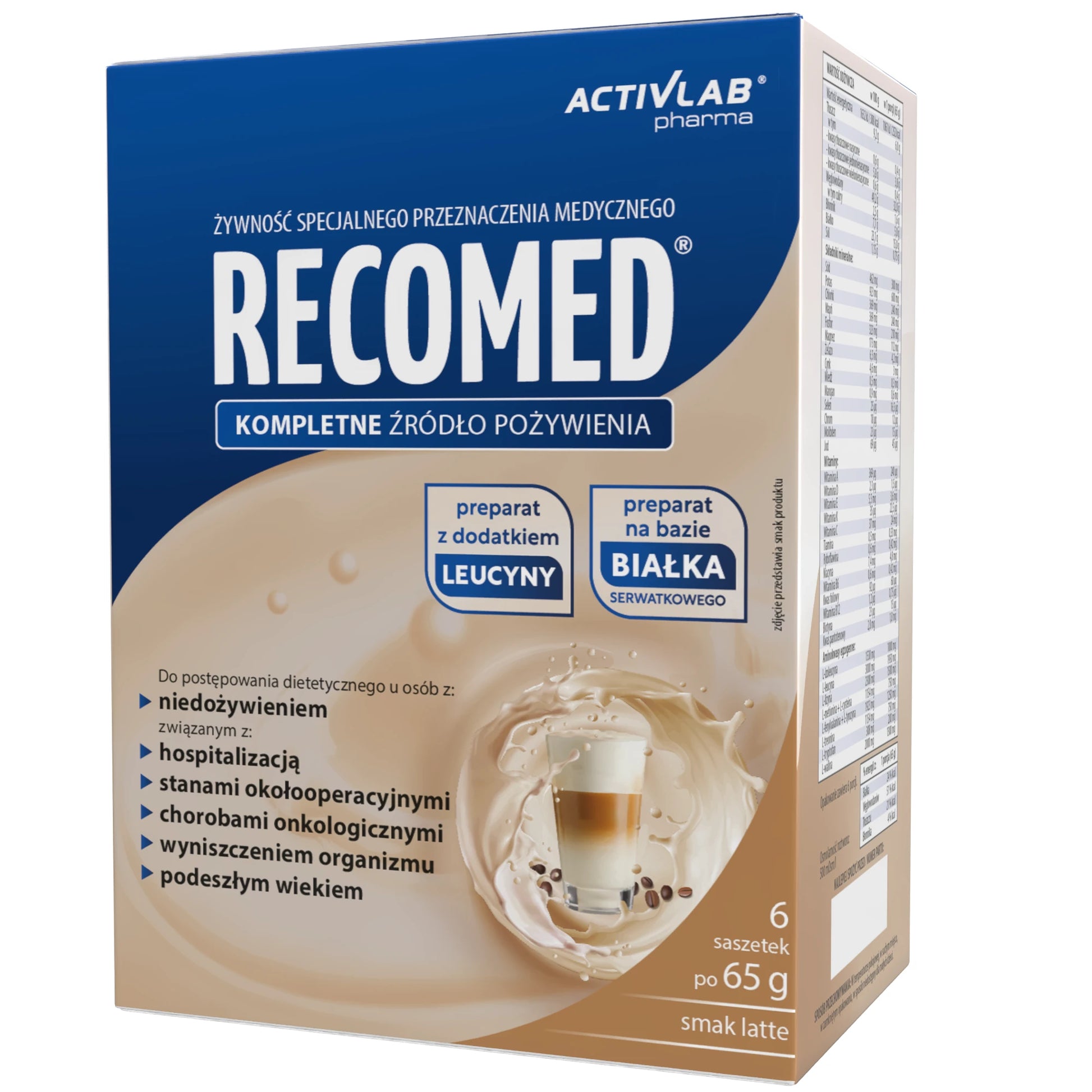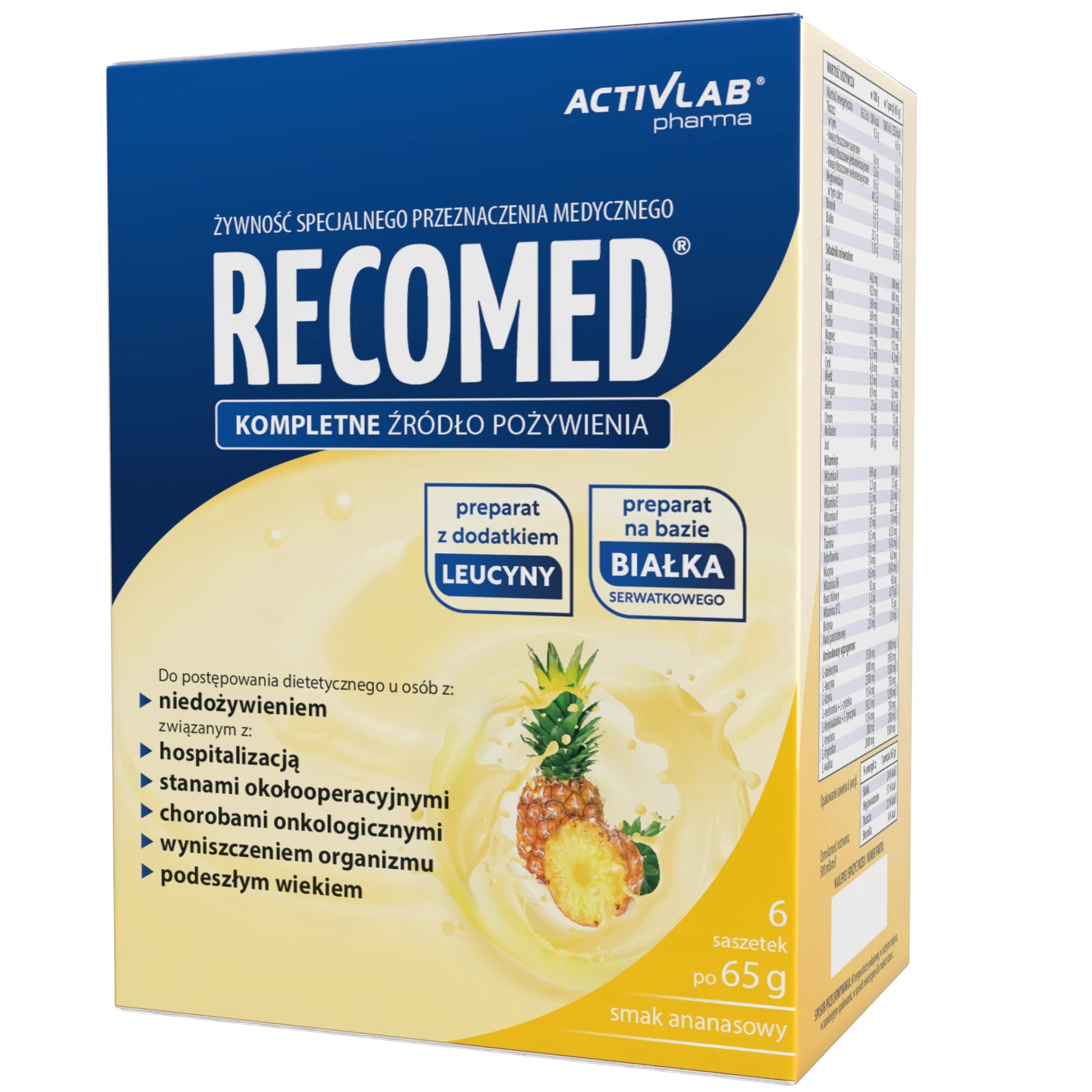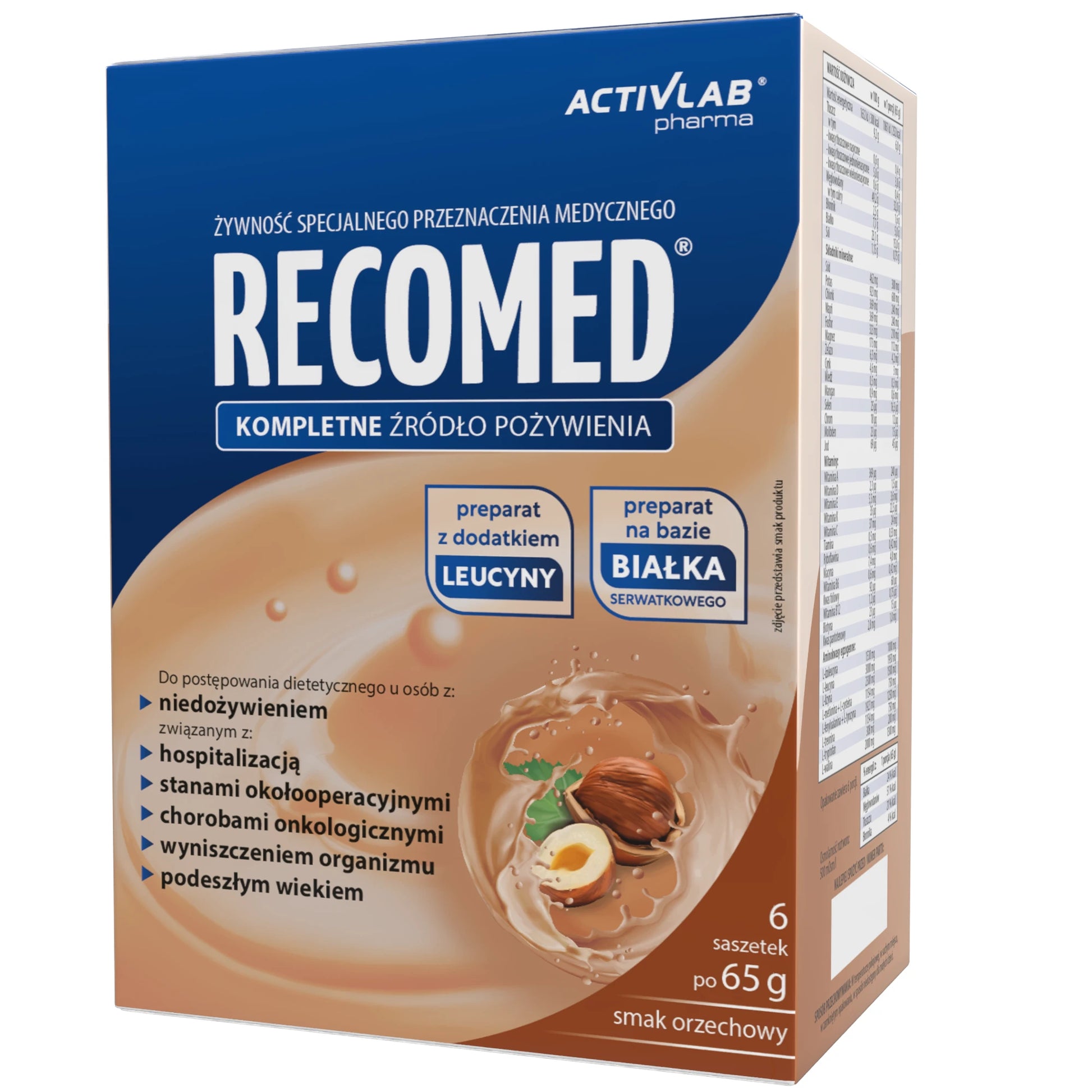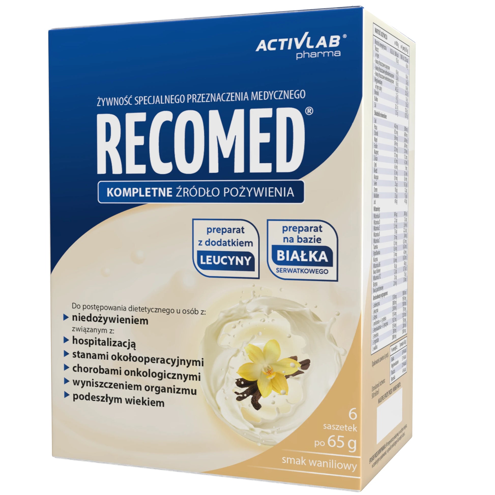 RecoMed zawiera wszystkie niezbędne składniki odżywcze: białko, węglowodany, tłuszcz, błonnik pokarmowy oraz komplet witamin i składników mineralnych.