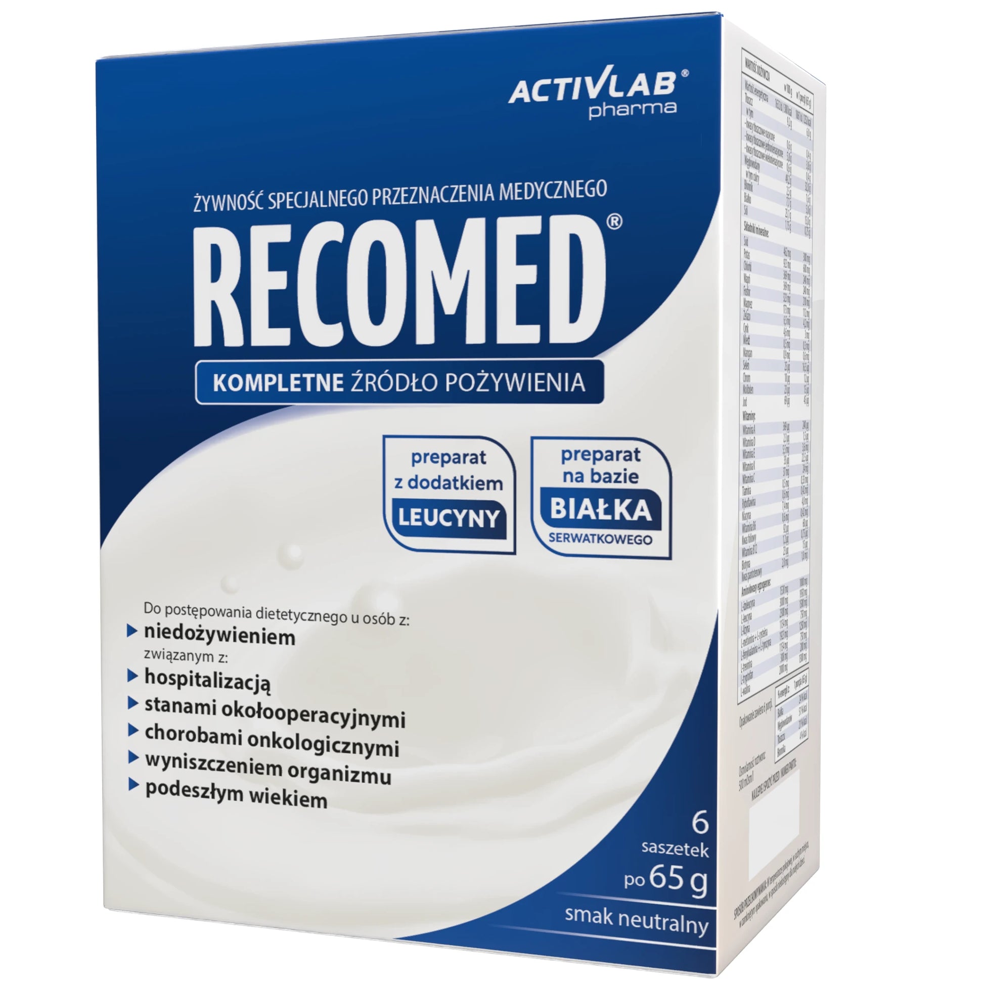 Food for special medical purposes. A complete food source with a composition that addresses the nutritional needs of individuals recovering from illness or surgery, as well as those who are malnourished or debilitated. RecoMed contains all essential nutrients: protein, carbohydrates, fat, dietary fiber, and a complete set of vitamins and minerals. The concentrated form of the product facilitates administration and does not place additional burden on the patient's body. The protein contained in the product is the highest quality whey protein concentrate (WPC) with a biological value of 104. The protein's amino acid composition has also been optimized by adding amino acids in the proportions necessary to increase the protein's nutritional value – achieving the optimal proportions of essential amino acids (EAAs) recommended for daily intake by the World Health Organization (WHO).